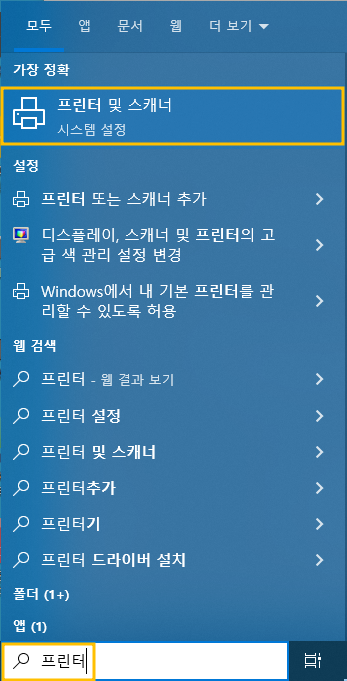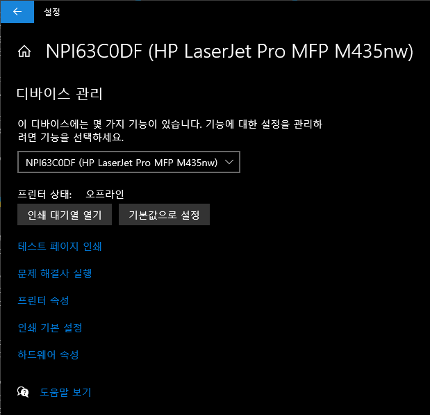 일단 프린터 설정으로 들어가기 위해 윈도우 키를 누르고 검색창에 '프린터'라고 입력합니다. 상단에 나오는 '프린터 및 스캐너' 를 클릭해 들어갑니다. 프린터 설정창의 리스트에서 오프라인인 HP 프린터를 클릭한 후 나오는 관리 버튼을 눌러서 프린터 관리 페이지로 들어간 후 프린터 속성을 클릭합니다.