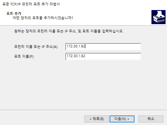포트 추가 마법사가 실행되면 아래와 같은 창이 뜨고, '다음' 버튼을 누른 후 프린터 이름 또는 IP 주소에 프린터에 할당한 IP 인 172.30.1.60을 입력합니다.