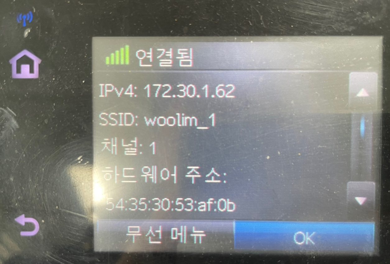 제 프린터의 경우 관리패널이 따로 아래와 같이 LCD 창으로 되어 있습니다. 네트워크 연결은 잘 되고 있으나, 오프라인인 상태였고, IP는 일단 172.30.1.62에 할당된 상태였습니다. 참고로 Wi-Fi 가 잘연결되어 있는 경우 왼쪽 상단에 파란 와이파이 표시가 나타납니다.