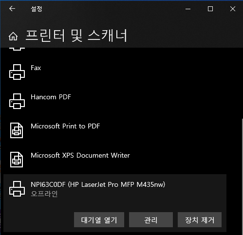 윈도우 키를 누르고 검색창에 프린터를 입력해 '프린터 및 스캐너' 설정으로 들어갑니다. 프린터 설정창의 리스트에서 문제가 되고 있는 HP 프린터를 클릭한 후 나오는 관리 버튼을 눌러서 프린터 관리 페이지로 들어간 후 프린터 속성을 클릭합니다.