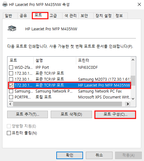 IP를 수정했으면 프린터의 포트를 변경해 새로 할당한 IP와 맞춰주도록 하겠습니다.