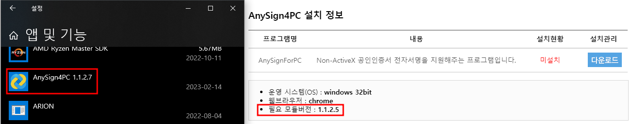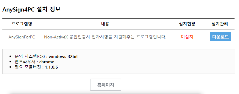 정부 사이트나 은행등에 가면, 인증서 보안프로그램으로 한컴시큐어사의 AnySign For PC 를 사용하고 있는 경우가 많습니다. 하단에 나오는 화면은 '복지로' 라는 정부 사이트에서 로그인할때 나온 보안프로그램 관련 안내 페이지로, 해당 사이트에서는 현재 1.1.2.5 버전을 요구하고 있습니다.