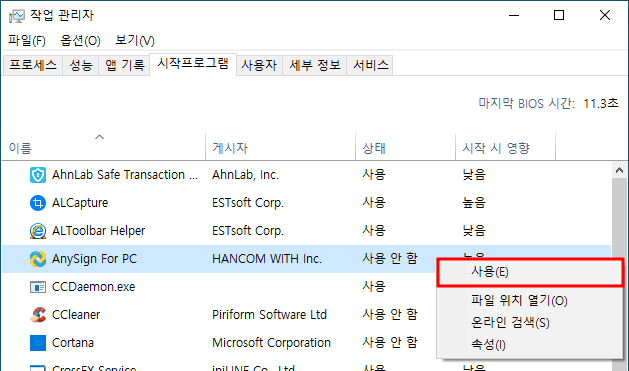 - 작업관리자에 들어가 시작프로그램에 있는 AnySign For PC 를 사용함으로 변경 후 재부팅