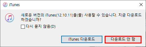 아이튠즈를 실행하면 아래와 같은 업데이트 안내 메세지가 뜨는데 '다운로드 안 함' 을 클릭해 무시해주시면 됩니다.