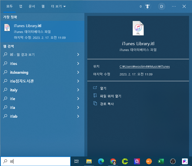 iTunes Library.itl 이라는 파일이 어디에 있는지 잘모르니 검색을 해보겠습니다. 일단 윈도우 키를 눌러서 검색창을 띄워주시고, itl 을 입력하면 iTunes Library.itl 이 검색되고, 해당 파일이 어디에 있는지 정보를 보여줍니다. 제 경우는 C:\Users\woolim4\Music\iTunes 에 있습니다. 윈도우 탐색기로 해당 폴더를 찾아 들어가시거나, 아래와 같이 나오는 검색창에서 '파일 위치 열기' 를 누르면 해당 폴더로 바로 이동하게 됩니다.