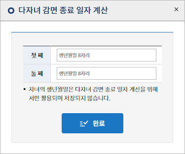 감면신청서 작성에 필요한 고객번호의 경우 계량기 번호가 나오는 동시에 확인이 됩니다. 해당 고객번호를 참고해서 감면신청서를 작성하시면 됩니다. 다른 개인정보 입력 후 아래에 다자녀감면정보에서 자녀수를 2로 적으시고 '종료일자 계산' 버튼을 누르시면 종료일자 계산에 필요한 자녀의 생년월일 정보를 넣게 합니다. 이때 입력한 자녀의 생년월일 정보를 바탕으로 자동으로 종료일자를 계산해서 감면혜택이 지속됩니다.