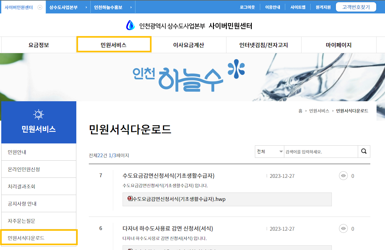감면 신청방법은 동주민센터로 방문을 하거나 인천광역시 상수도사업본부 사이버민원센터(http://minwon.waterworksh.incheon.kr) 에서 신청하실 수 있어서, 한번 인터넷으로 신청하는 방법을 살펴보도록 하겠습니다.