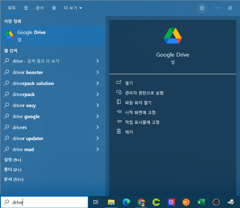 2. drive 를 타이핑 한 후 찾기에서 google drive 검색