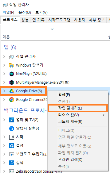 3. 구글드라이브 프로세스에 마우스 버튼을 눌러 메뉴불러오기