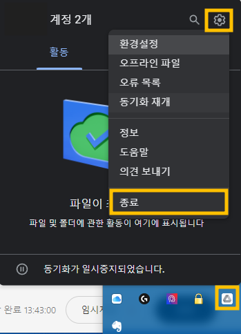 일단 윈도우 하단 작업표시줄 실행중인 프로세스들이 모여있는곳에서 구글드라이브를 찾습니다. 일단 ^ 표시를 눌러서 모든 아이콘 보기를 해주고, 구글 드라이브 아이콘에 마우스 오른쪽 클릭해 메뉴를 불러옵니다. 우측 상단에 톱니바퀴 모양의 설정하기를 클릭한 후 종료를 눌러서 종료합니다.